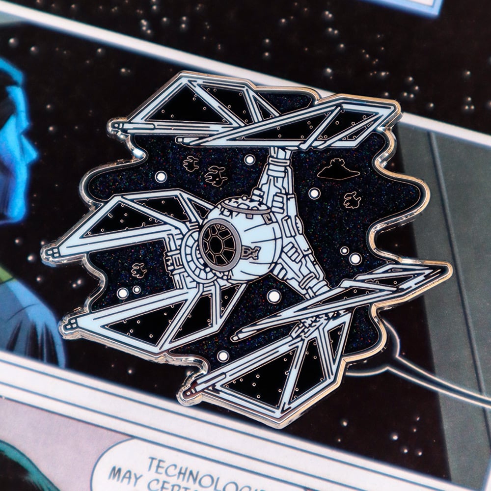 Enamel pin inspired by a TIE Defender. Pin Specs: - Nickel Metal - Hard Enamel - Screen Printed Details - Glitter - Double post w/ black rubber clutches - Approximately 2.0” - Punch It Chewie Press backstamp